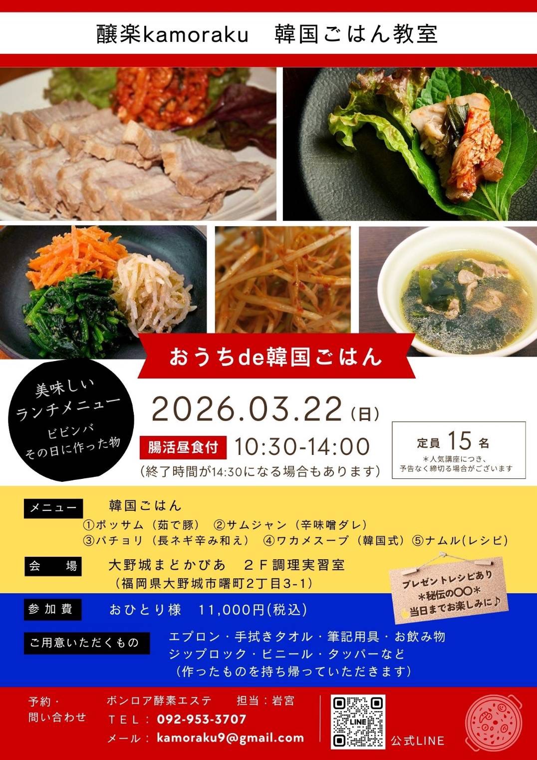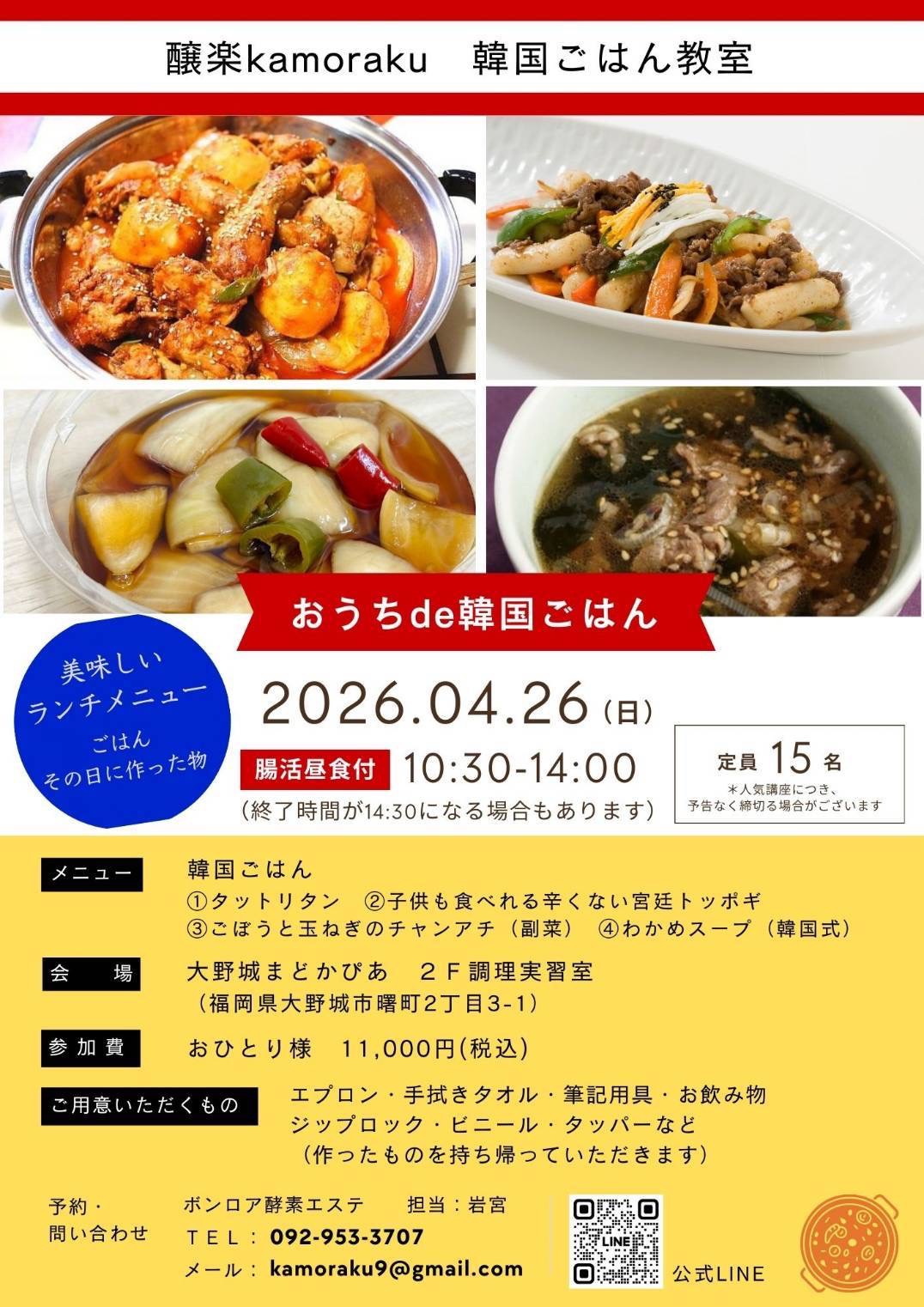 カモラクではキムチなどの発酵食品をはじめとする、本格的な韓国料理教室を一般の方にもわかりやすく丁寧に、楽しく伝授する料理教室を定期開催しています。定員になり次第、締め切りますので、お早めにご連絡下さい。(TEL:092-953-3707 📧 kamoraku9@gmail.com)